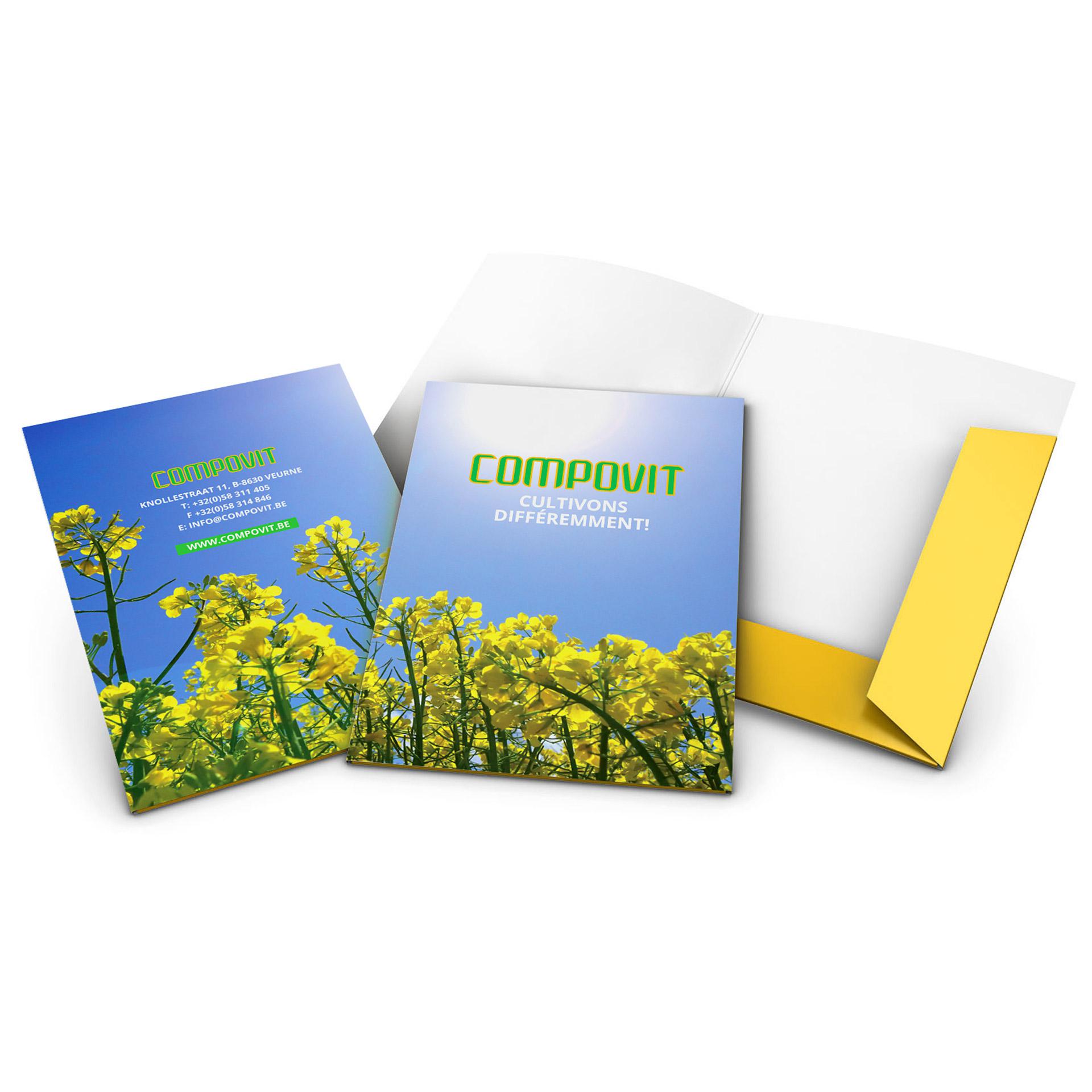 Grafisch bureau Publi4U stond in voor het ontwerpen en drukken van presentatiemappen met visitekaarthouder voor Compovit uit Rollegem en Veurne.