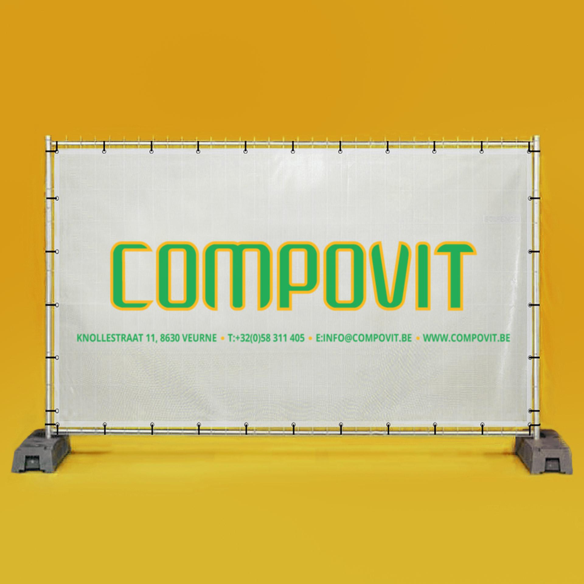 Grafisch bureau Publi4U stond in voor het ontwerpen en drukken van werfdoeken (mesh zodat ze winddoorlatend zijn) voor Compovit uit Rollegem en Veurne.
