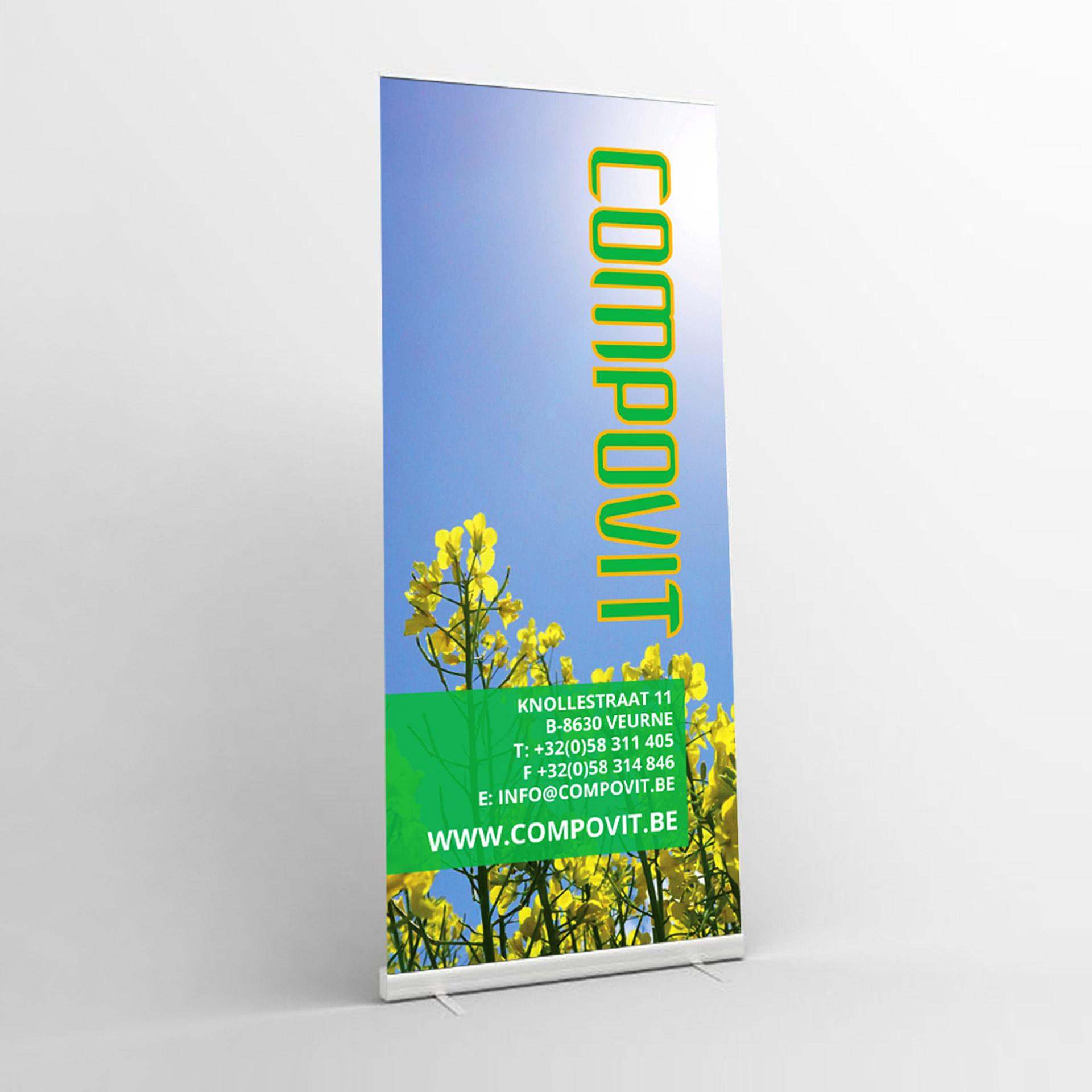 Grafisch bureau Publi4U stond in voor het ontwerpen en drukken van roll-up banners voor Compovit uit Rollegem en Veurne.